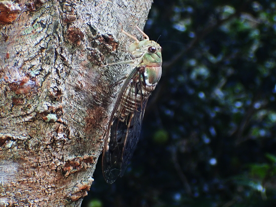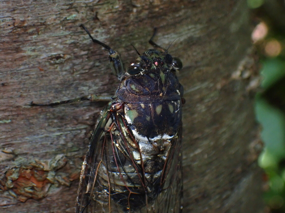 | ▲ミンミンゼミ Hyalessa maculaticollis (Motschulsky, 1866) 2021.07.22 対馬市厳原町 ※やや緑色部が発達した個体 |