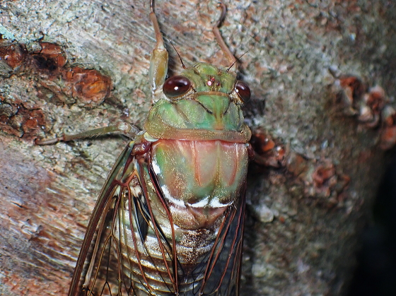 初めて見るタイプのミンミンゼミ。 normal〜f.mikadoの中間型のような感じ…。 腹面に黒色は全くありません。 |