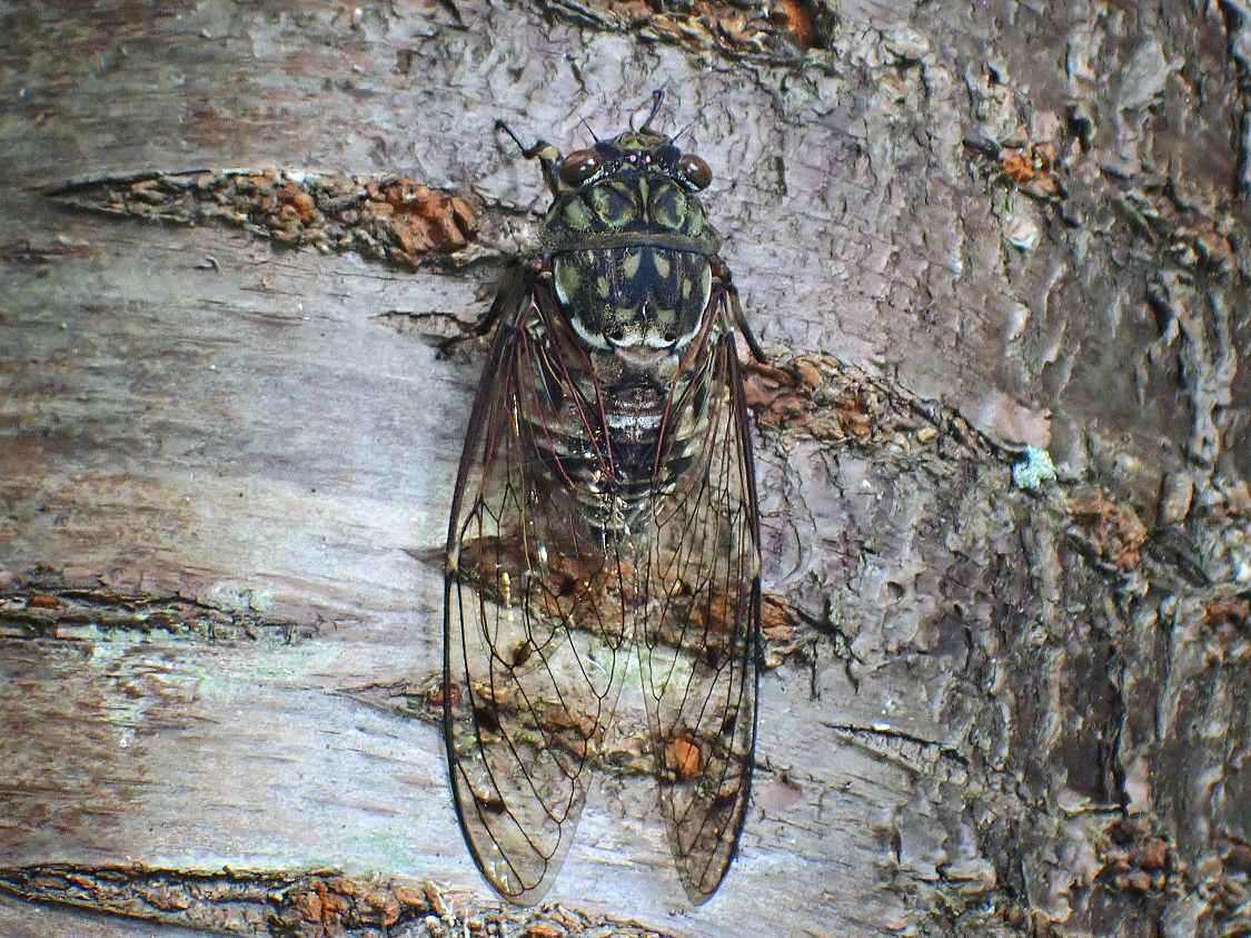 | ▲ミンミンゼミ Hyalessa maculaticollis (Motschulsky, 1866) 2024年8月26日 対馬市厳原町 ※対馬産の中では胸背の緑紋が発達した個体。緑紋もこのようにくすんだ暗い色合いであることが多い。 |