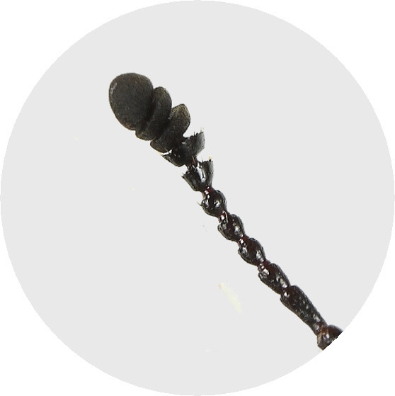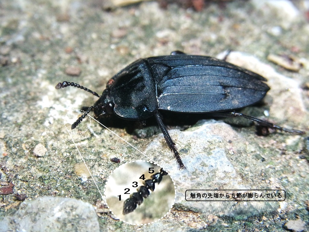 近似のオオヒラタシデムシとは触角の形態で区別できます。ツシマヒラタシデムシは触角の先端から5節目までが膨らみます。