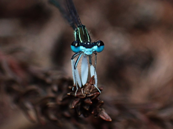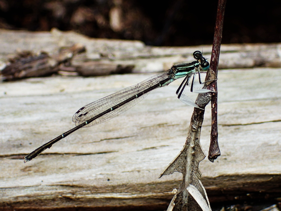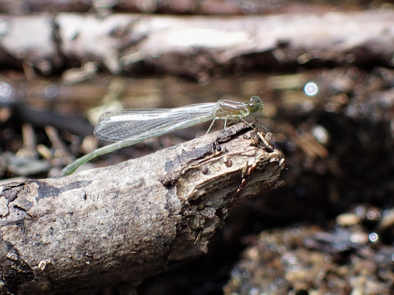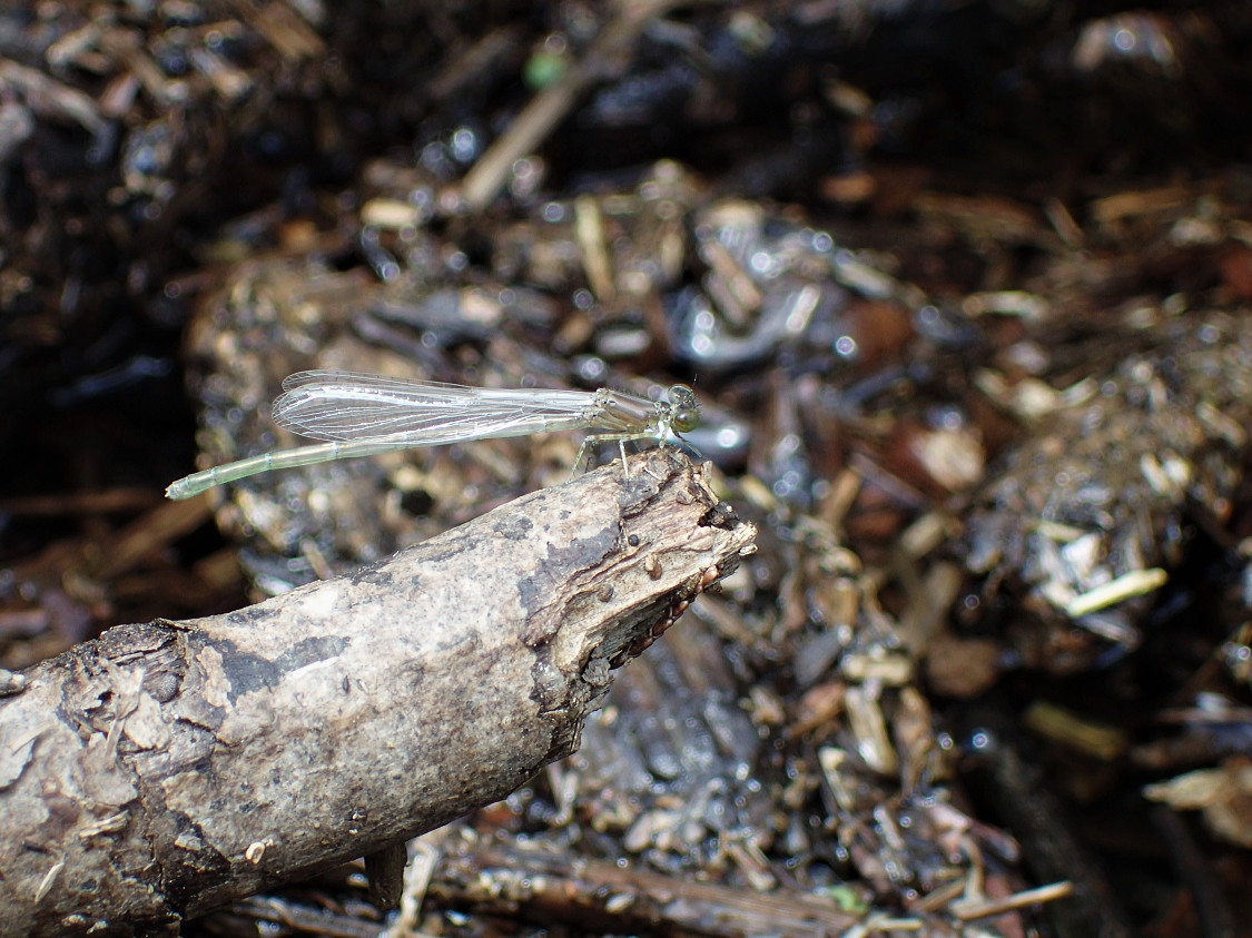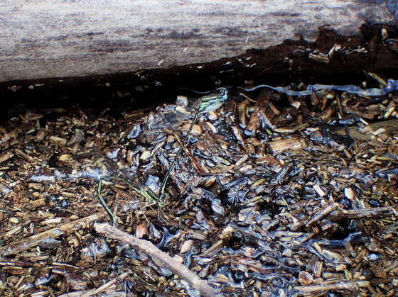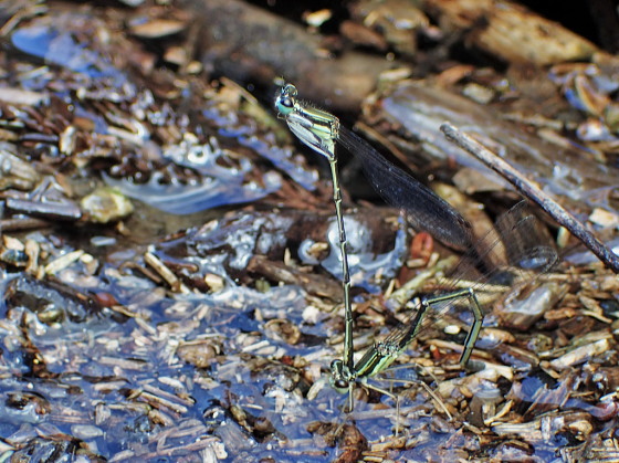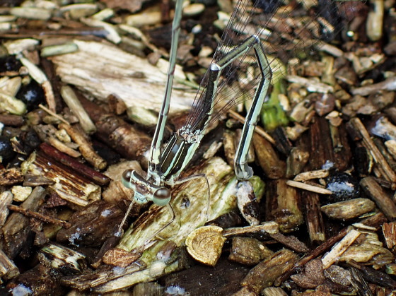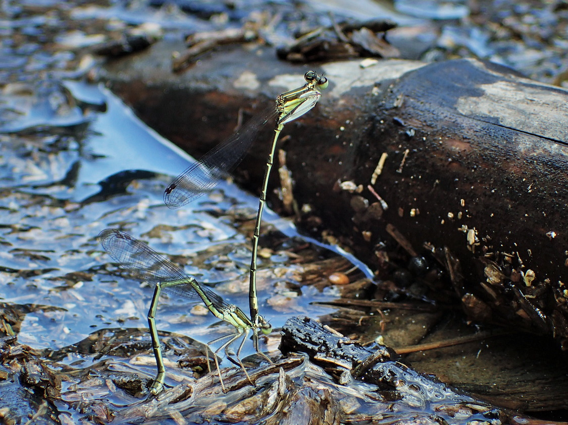 その岸辺は朽ちた流木と細かな木片で覆われていましたが,連結して飛び回ったり産卵したりする複数のペアや羽化直後と思われる個体を確認することができました。発生地には水草らしい植物は一切生えてなく,産卵は水面に浮遊している細かい木屑に行われていました。