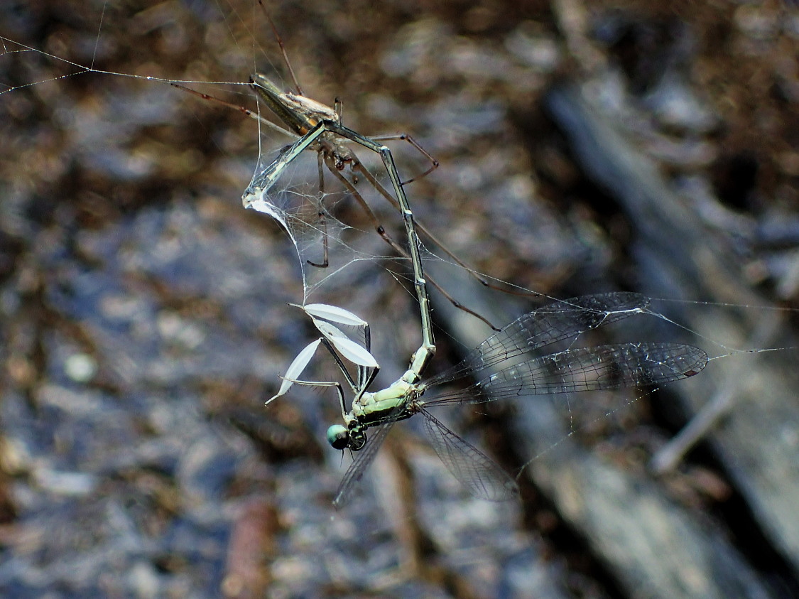 | ▲チョウセングンバイトンボ Platycnemis phyllopoda Djakonov, 1926 クモの巣に捕らえられた♂ 2021.08.04 対馬市上対馬町瀬田(目保呂ダム) |