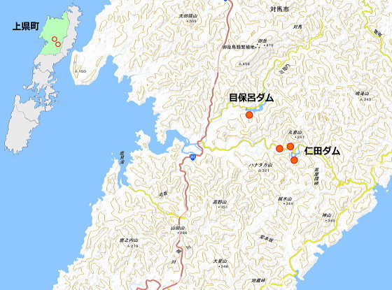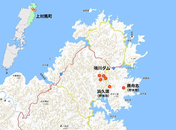 | 現在まで確認できた発生地は上県町(2カ所),上対馬町(3カ所)の5カ所です。いずれも小渓流域からの流れが貯水域にかかる狭間が発生地になっているようです。 |