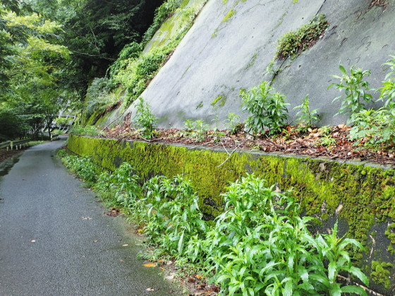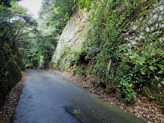 最初の発見地はダム周回道路の道路沿いでした。地形の状況から谷筋から移動して来ていると推察されたので,道路から急斜面を10数mの降りてみることにしました。