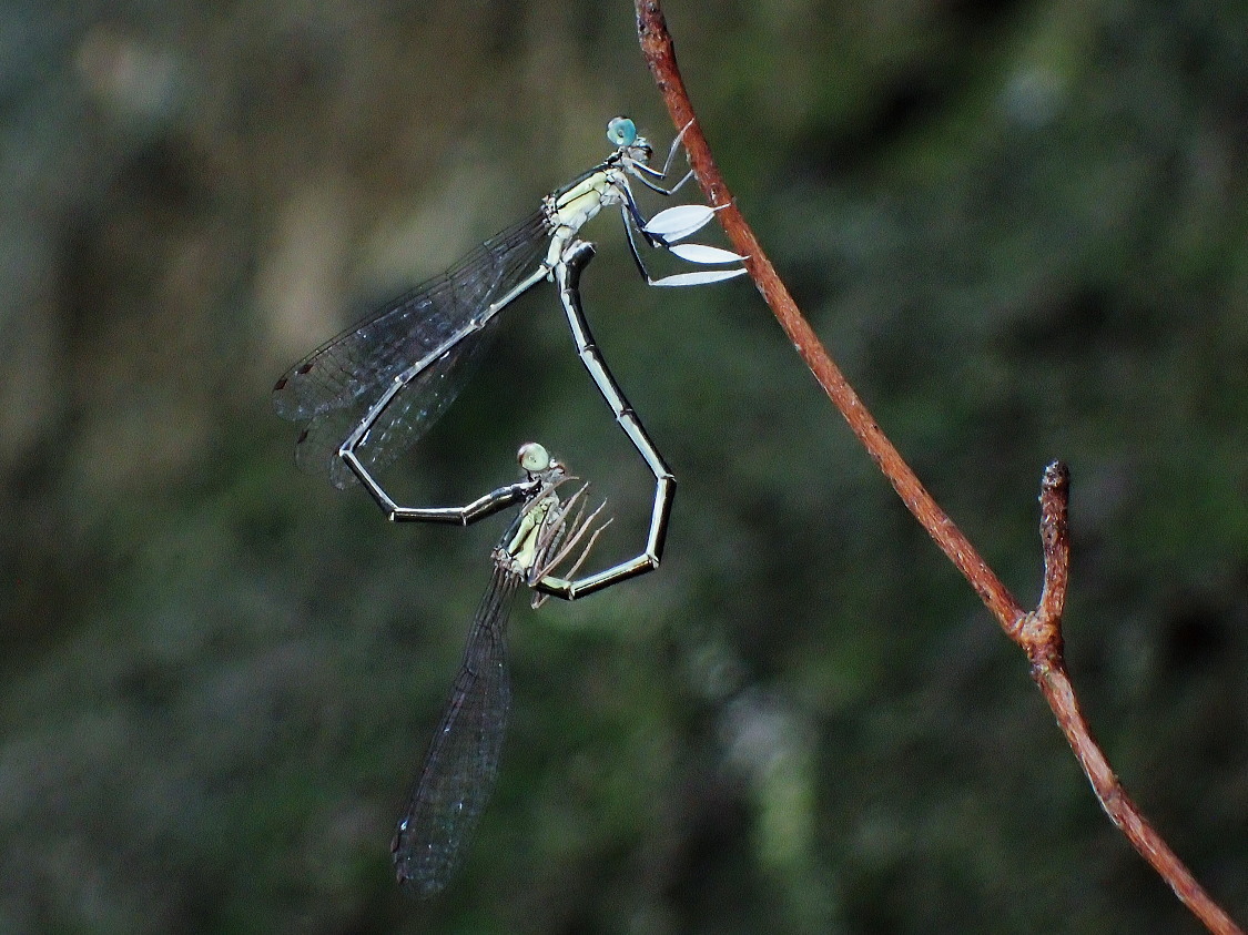 | ▲チョウセングンバイトンボの連結産卵 Platycnemis phyllopoda Djakonov, 1926 2021.08.04 対馬市上県町瀬田(目保呂ダム) |