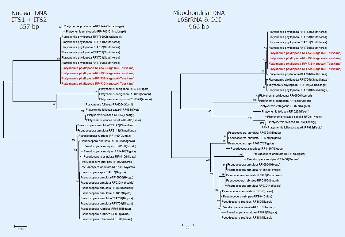 | ▲チョウセングンバイトンボのDNA解析 Platycnemis phyllopoda Djakonov, 1926 対馬市上県町瀬田産(目保呂ダム)の個体を使用 |